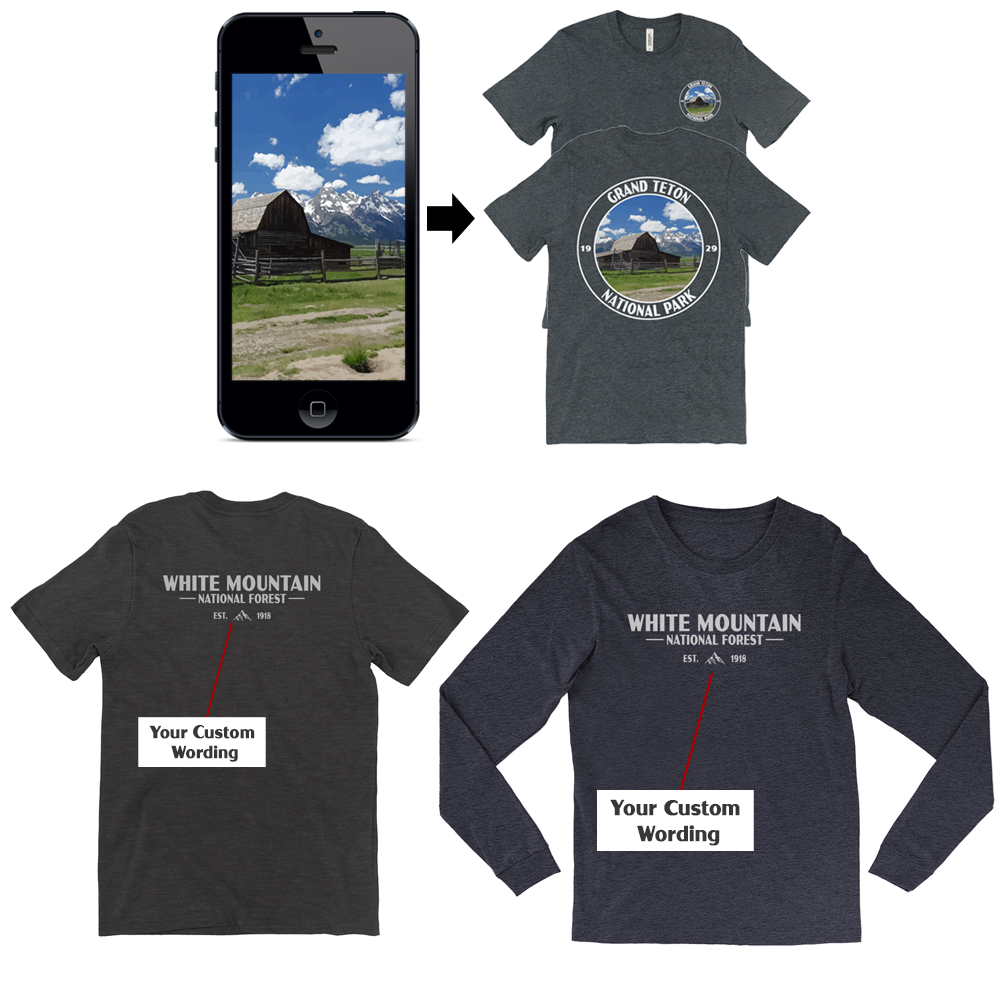 We can take your photo and turn it into a National Park-Style Shirt, or create a custom shirt with your own text! Photos can be from anywhere in the world.